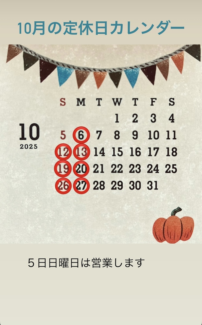 10月週末は埋まっている日もありますので 電話でご確認ください