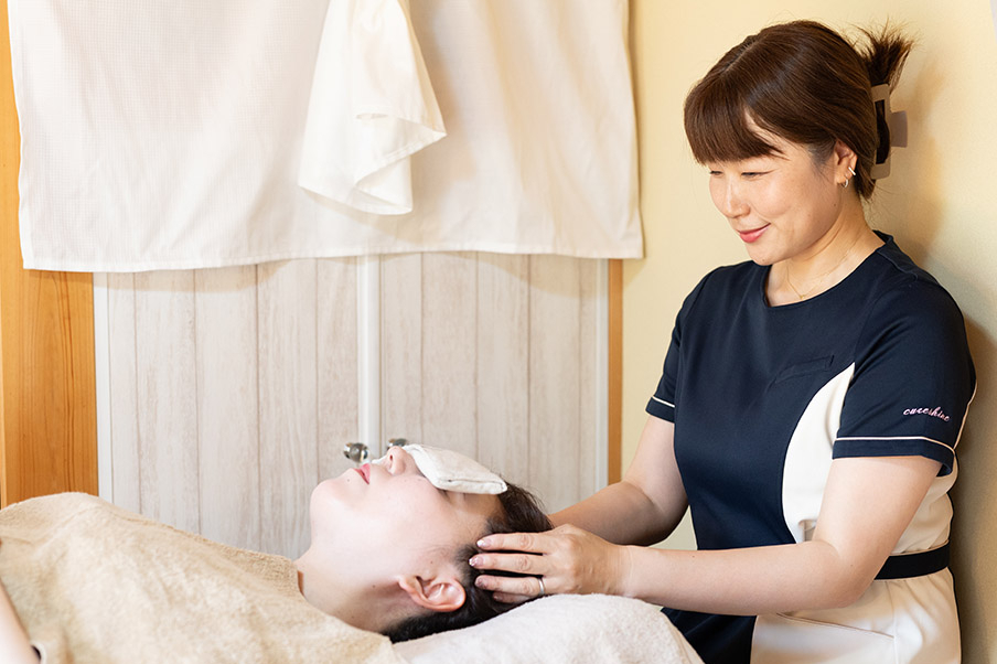 ハーブテント後は、着替えをしてドライヘッドケアへ。心地よい圧で頭を中心に、肩、首、耳などもほぐしていきます。終わった後は頭がスッキリ、目元はパッチリしてリフレッシュ♪ 眠りが浅い、不眠でお悩みの方にも最適です。