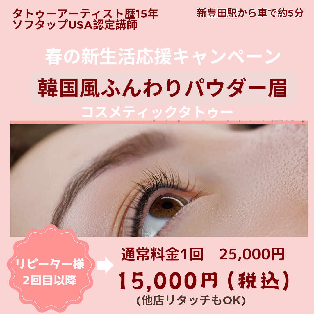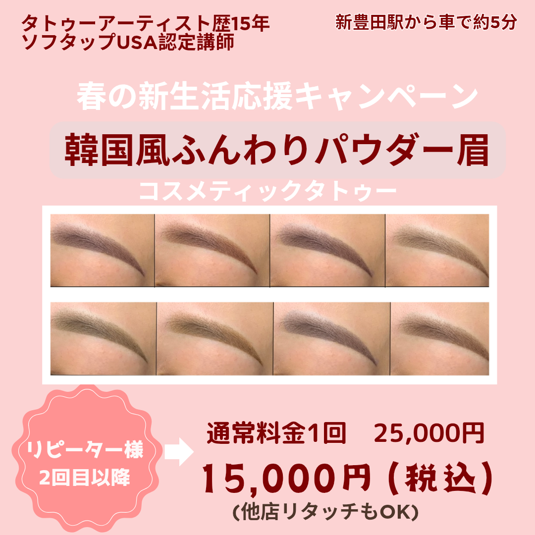 コスメティックタトゥーは、色素を定着させる為に基本的に2回で完成させます。デザインの微調整を行う為に1回目は主にベース作りで2回目の施術で調整しご希望に沿ったデザインに仕上げます。