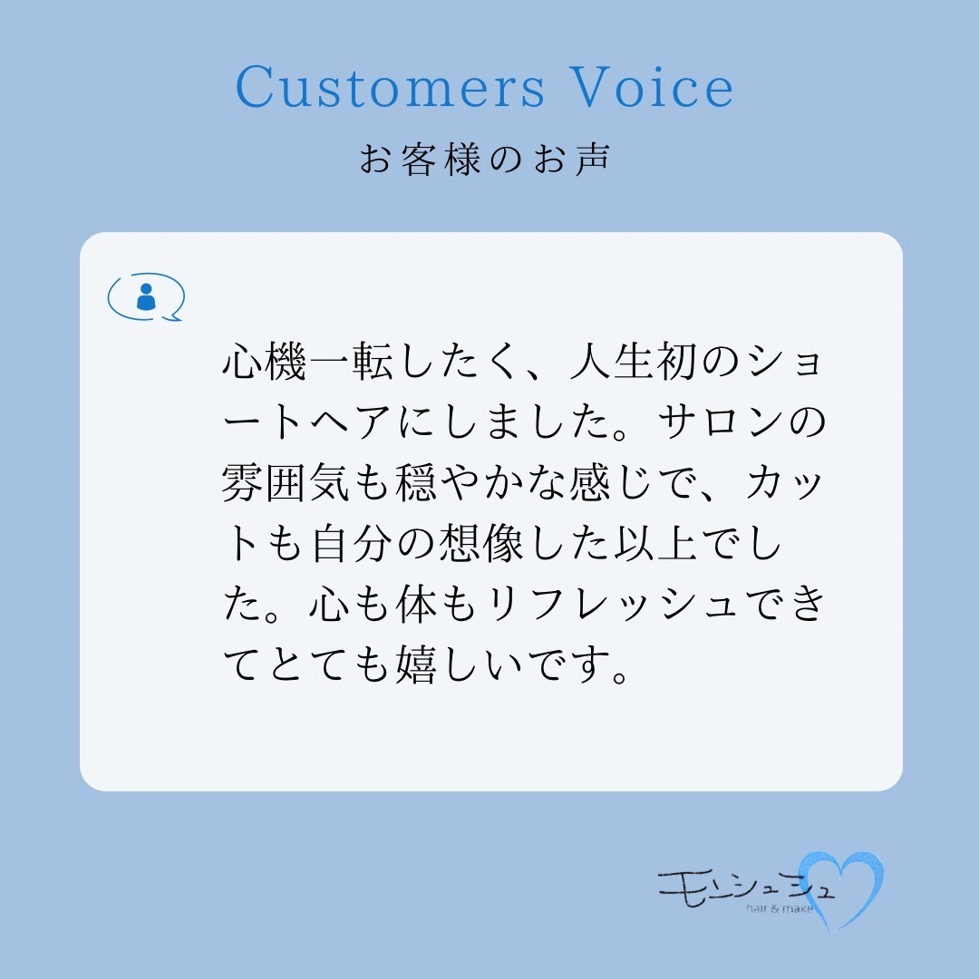 心機一転したく、人生初のショートヘアにしました。サロンの雰囲気も穏やかな感じで、カットも自分の想像した以上でした。心も体もリフレッシュできてとても嬉しいです。