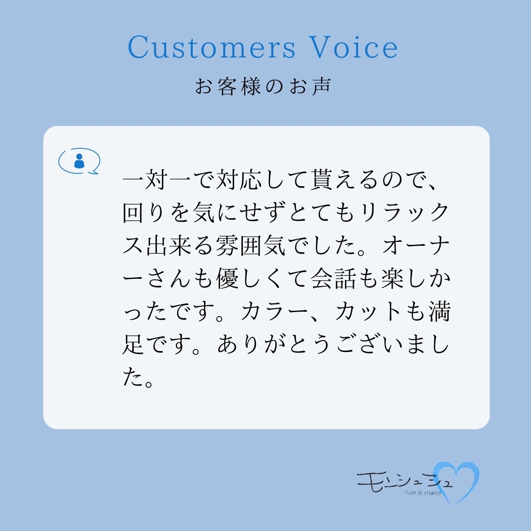 一対一で対応して貰えるので、回りを気にせずとてもリラックス出来る雰囲気でした。オーナーさんも優しくて会話も楽しかったです。カラー、カットも満足です。ありがとうございました。