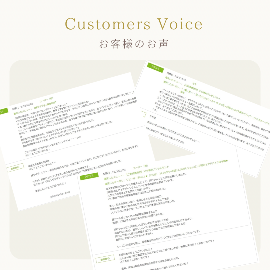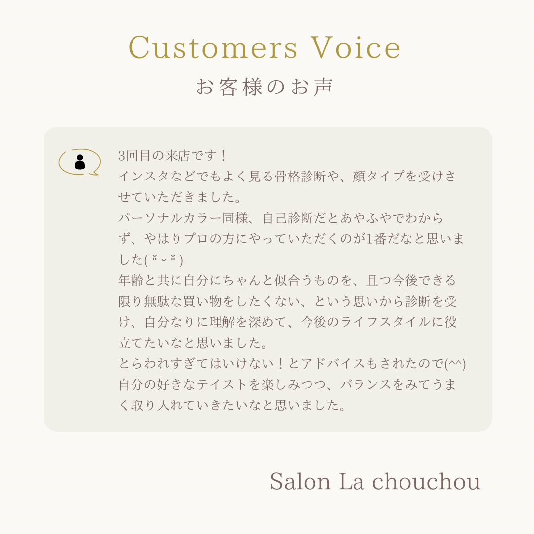 年齢と共に自分にちゃんと似合うものを、且つ今後できる限り無駄な買い物をしたくない、という思いから診断を受け、自分なりに理解を深めて、今後のライフスタイルに役立てたいなと思いました。