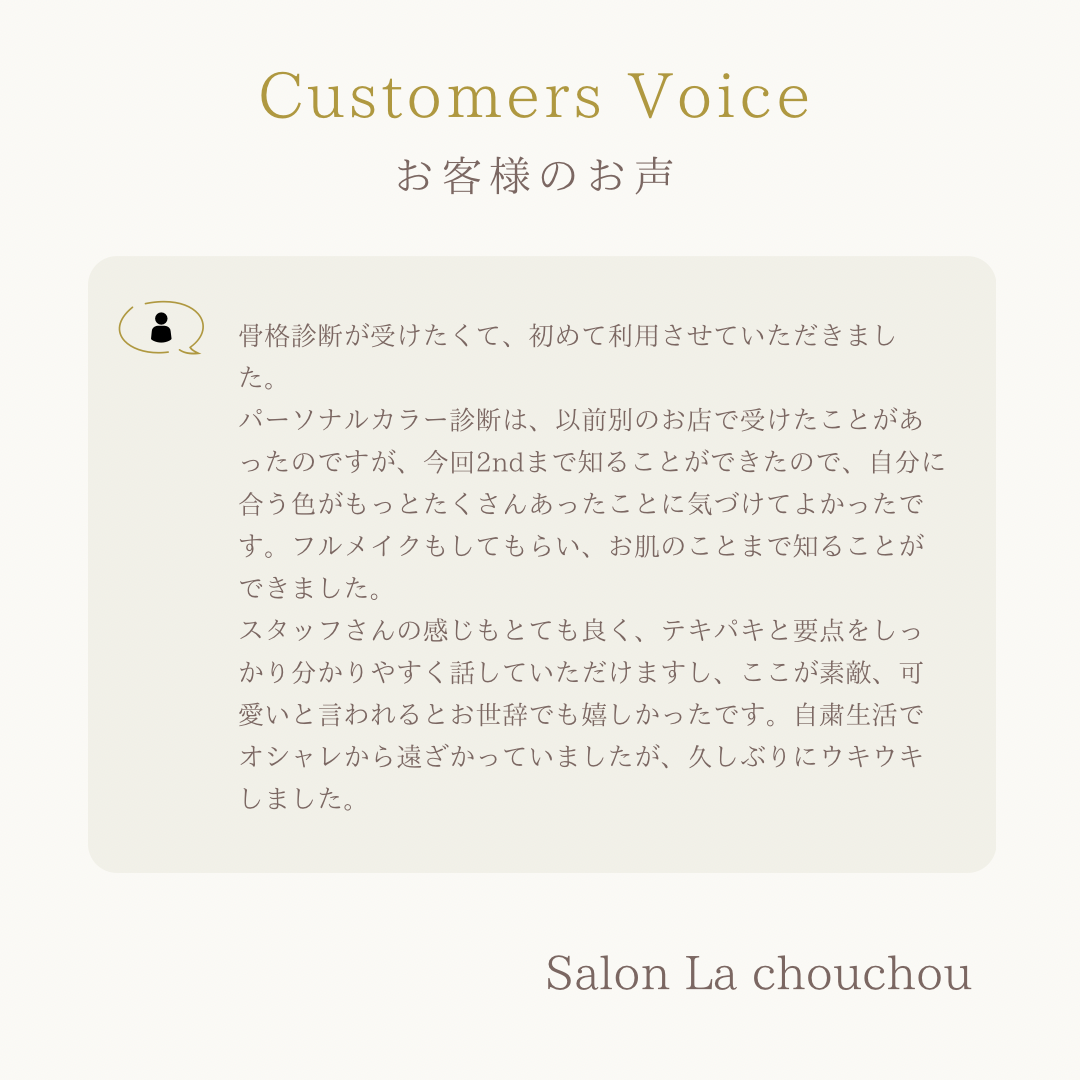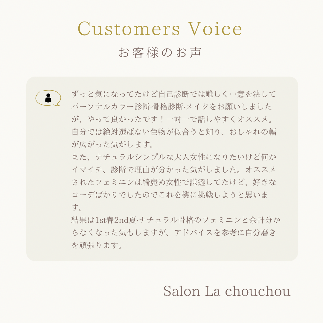 ずっと気になってたけど自己診断では難しく…意を決してパーソナルカラー診断·骨格診断·メイクをお願いしましたが、やって良かったです!一対一で話しやすくオススメ。