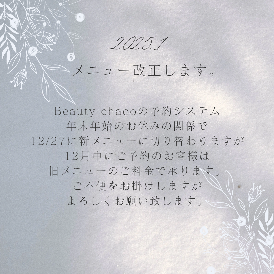 Beauty chaooさんの年末年始のお休みの関係で、12/27に新メニューに切り替わりますが、12月中にご予約をされたお客様は、旧メニューでのご料金となります。