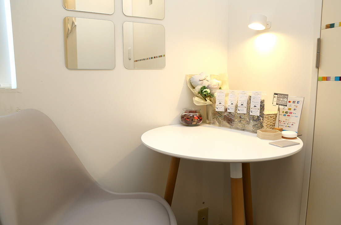 施術中の快適さにもこだわり、大きめサイズのベッドや、肌にやさしいコットン100%のシーツや枕を使用。心地よい空間で、リラックスしながら心身のケアを受けていただけます。施術後は、こだわりのハーブティーで心もほっこりリラックス♪