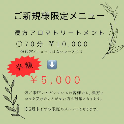 通常100分または130分からしか選べない「漢方アロマトリートメント」が、なんと70分の体験コース&半額価格で受けられるチャンスです♪