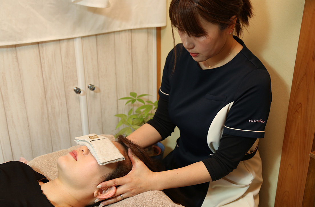 ハーブテントの後は、首・肩・腕・耳までしっかりほぐす 「深眠タッチセラピー®」 を施術。