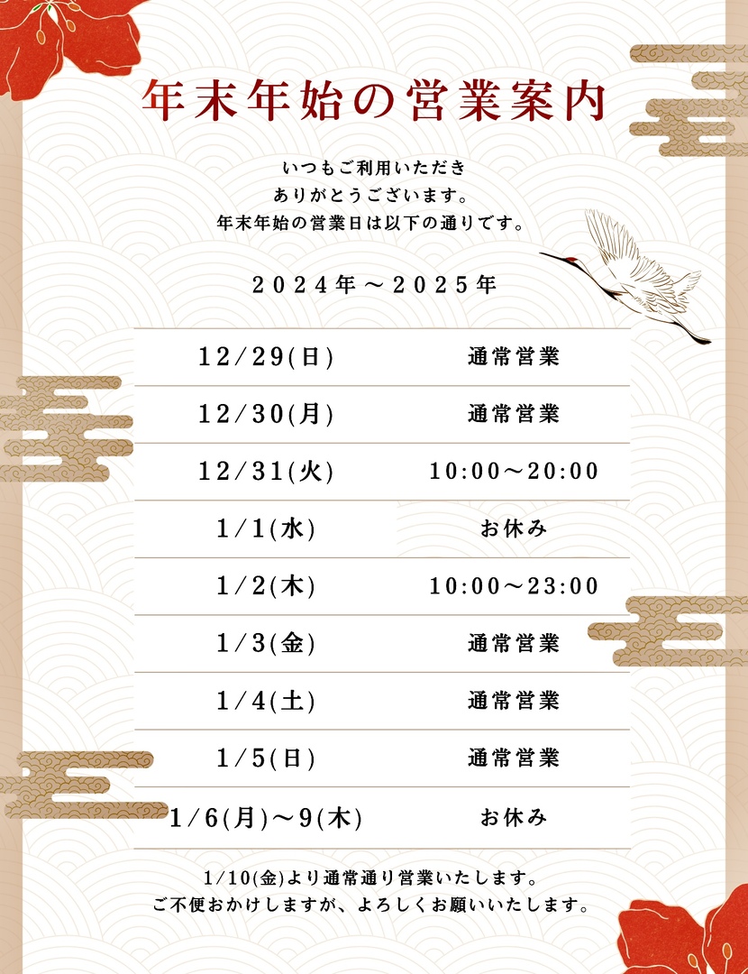 年末年始の営業時間のご案内。