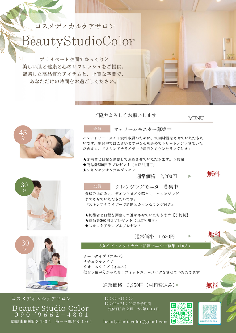 美容資格取得者の資格取得中や取得後の練習として、フェイシャルトリートメント、クレンジング、フィットカラー診断(似合うパーソナルカラー)、メイクが出来る様になる為の練習を行っております。