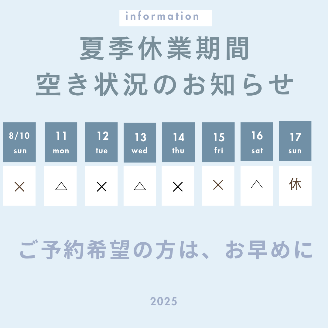 夏季休業期間も営業しておりますが、空き枠が残りわずかとなっております。