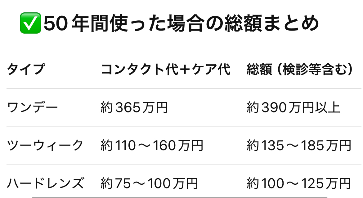 今回は、ワンデー・ツーウィーク・ハードコンタクトの3タイプについて、50年間使い続けた場合の総費用をわかりやすく試算してみました。