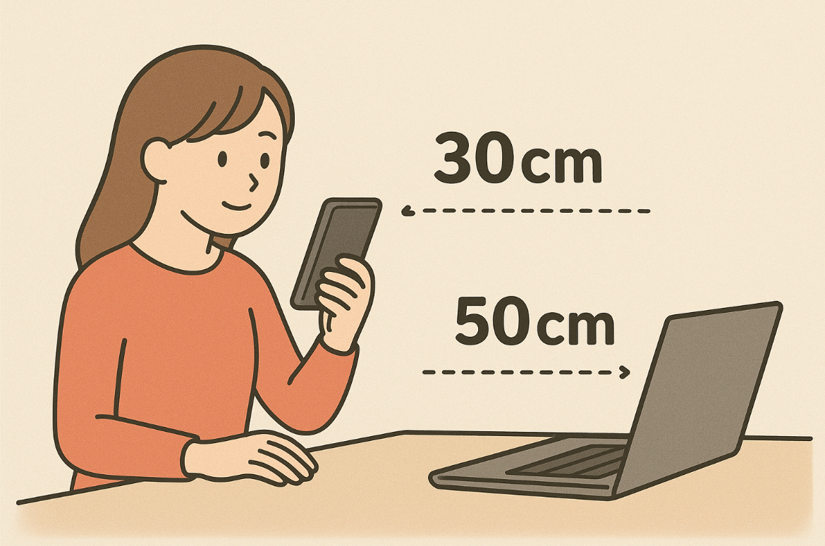 スマホは30cm以上、パソコンは50cm以上離して使うようにしましょう。