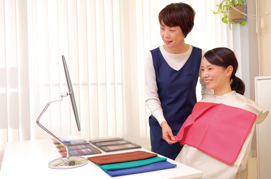 顔色が明るく見える色や、印象アップにつながるカラーを見つけていきます。