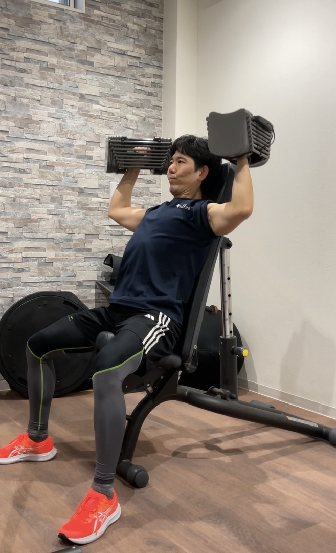 適切なフォームでのショルダープレスは、血行を促進し、ガチガチの肩こり解消への近道です。
